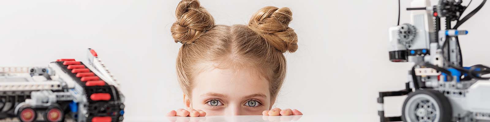 Published September 19, 2018 at 1600 × 400 in Cheerful curious smiling little female person near modern toys Interested girl is hiding behind table and looking at camera with expectation. Robots are on countertop. Close up